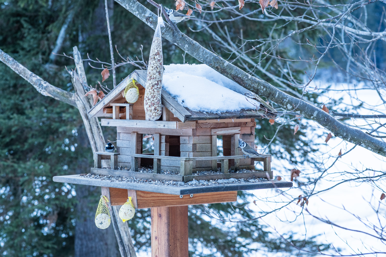 Wir entscheiden uns, den Ödensee im Uhrzeigersinn zu umrunden und gehen links auf dem von Schnee geräumten Weg entlang. Wir kommen an einem Spielplatz vorbei und an mehreren Holzhütten, die über dem zugefrorenen See zu schweben scheinen. Im Winter kaum vorstellbar, aber im Sommer ist der Ödensee ein Badesee.