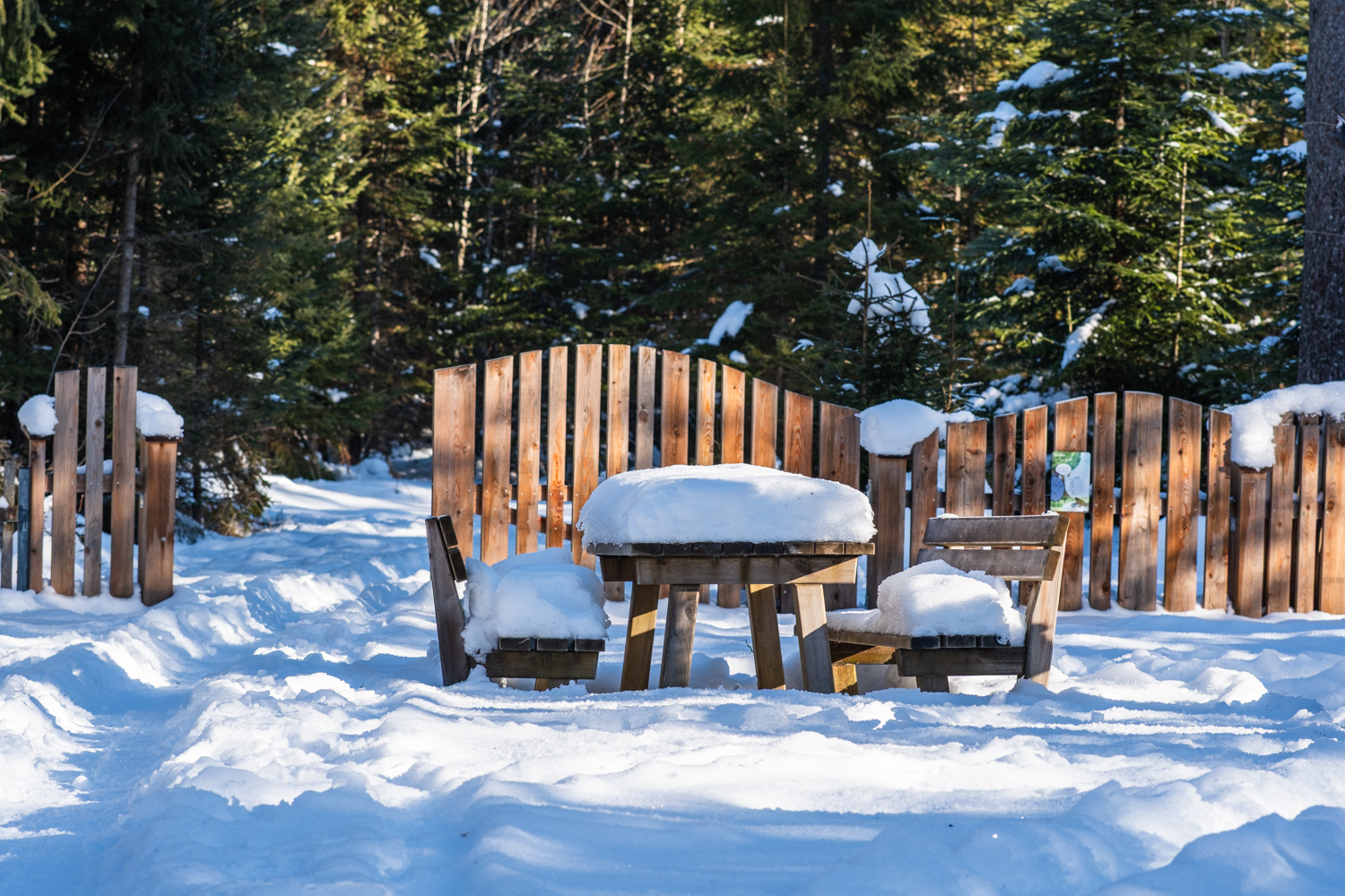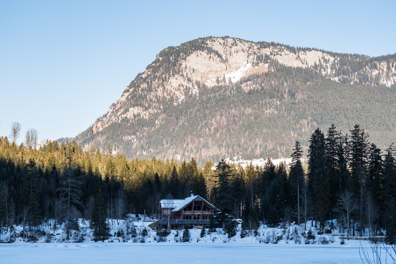 Eine idyllische Winterwanderung rund um den verschneiten Ödensee im Ausseerland: Der präparierte Weg führt durch den Fichtenwald, vorbei an Holzhütten und bietet herrliche Ausblicke.