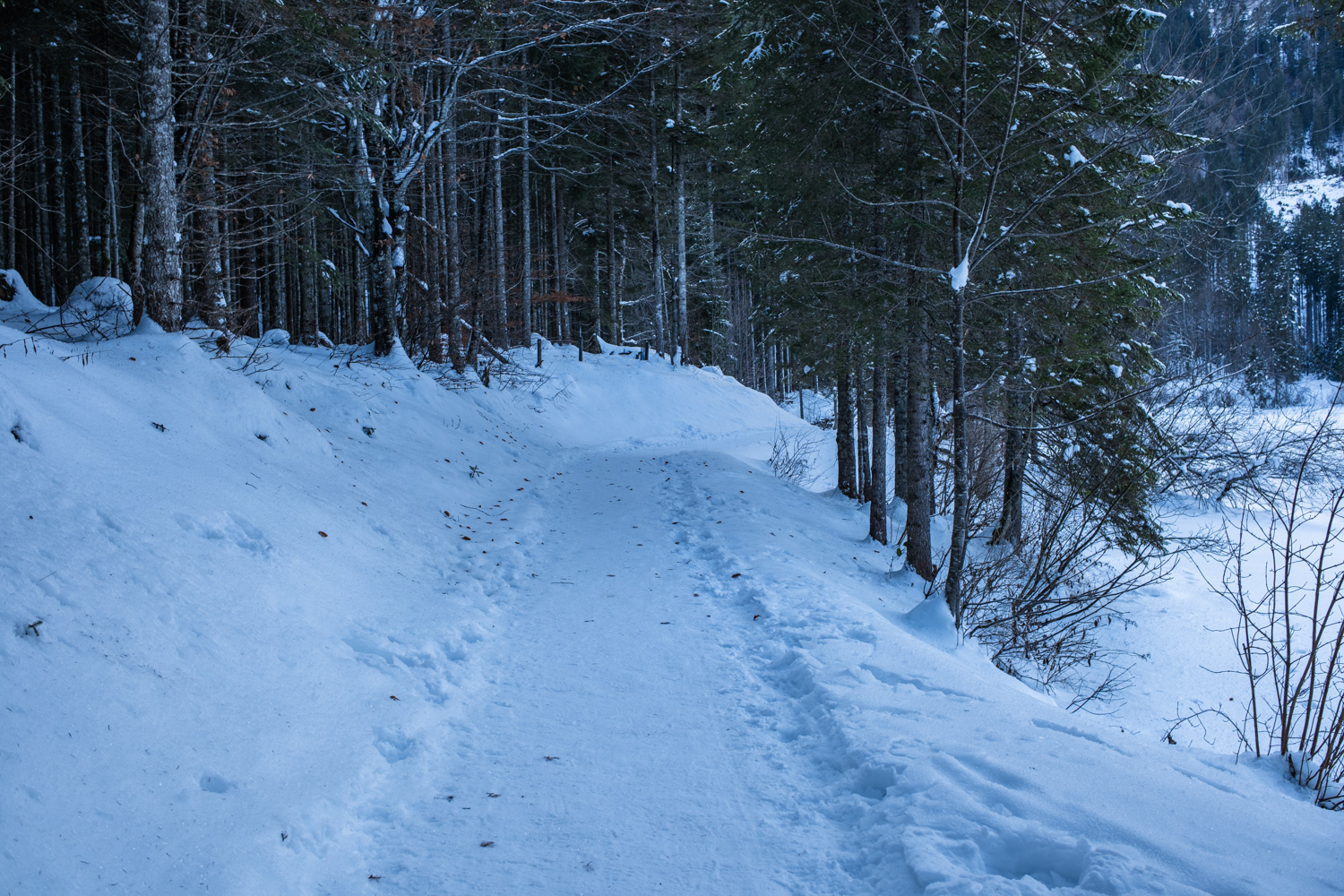 Schon nach kurzer Zeit haben wir den halben See umrundet, dabei sehen oder hören wir mehrmals Langläufer, deren Loipe kurzzeitig unseren Weg kreuzt. Und dann erblicken wir endlich das mächtige Grimming-Massiv (2.351 m) hinter bzw. oberhalb des Fichtenwaldes. Nun ist es auch nicht mehr weit bis zu unserem Ausgangspunkt und einer gemütlichen Einkehr steht nichts mehr im Wege.