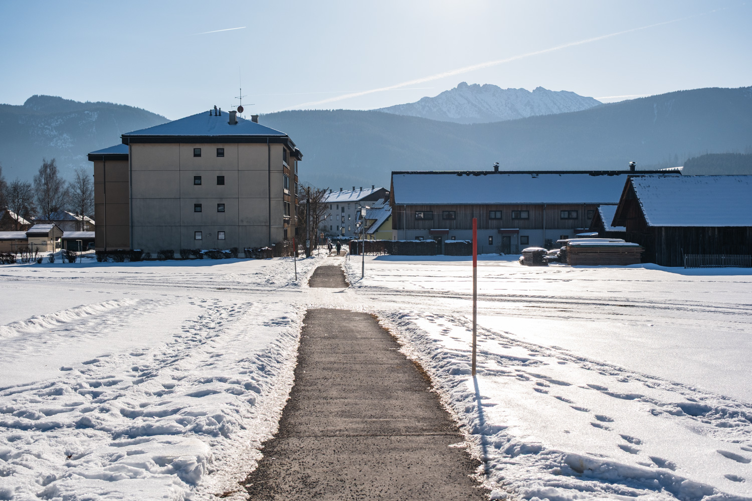 Als wir wieder auf die Salza treffen, verläuft die Route im Winter nicht durch den Wald sondern geradeaus weiter am Waldrand entlang, wie die Wegtafel anzeigt. Hier könnte man auch abkürzen und links wieder nach Bad Mitterndorf gehen. Wir bleiben jedoch links der Salza und setzen unseren Weg am Pötscherwald fort und blicken von weitem auf die Hubertusalm linkerhand. Nach einer leichten Kurve nach rechts queren wir die Eisenbahnschienen und stehen schon wieder im Ortszentrum von Bad Mitterndorf.