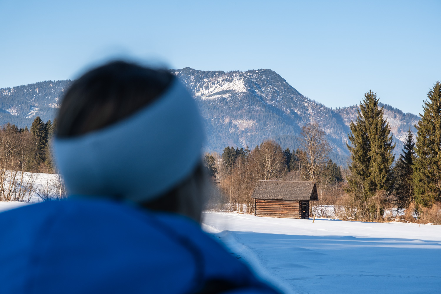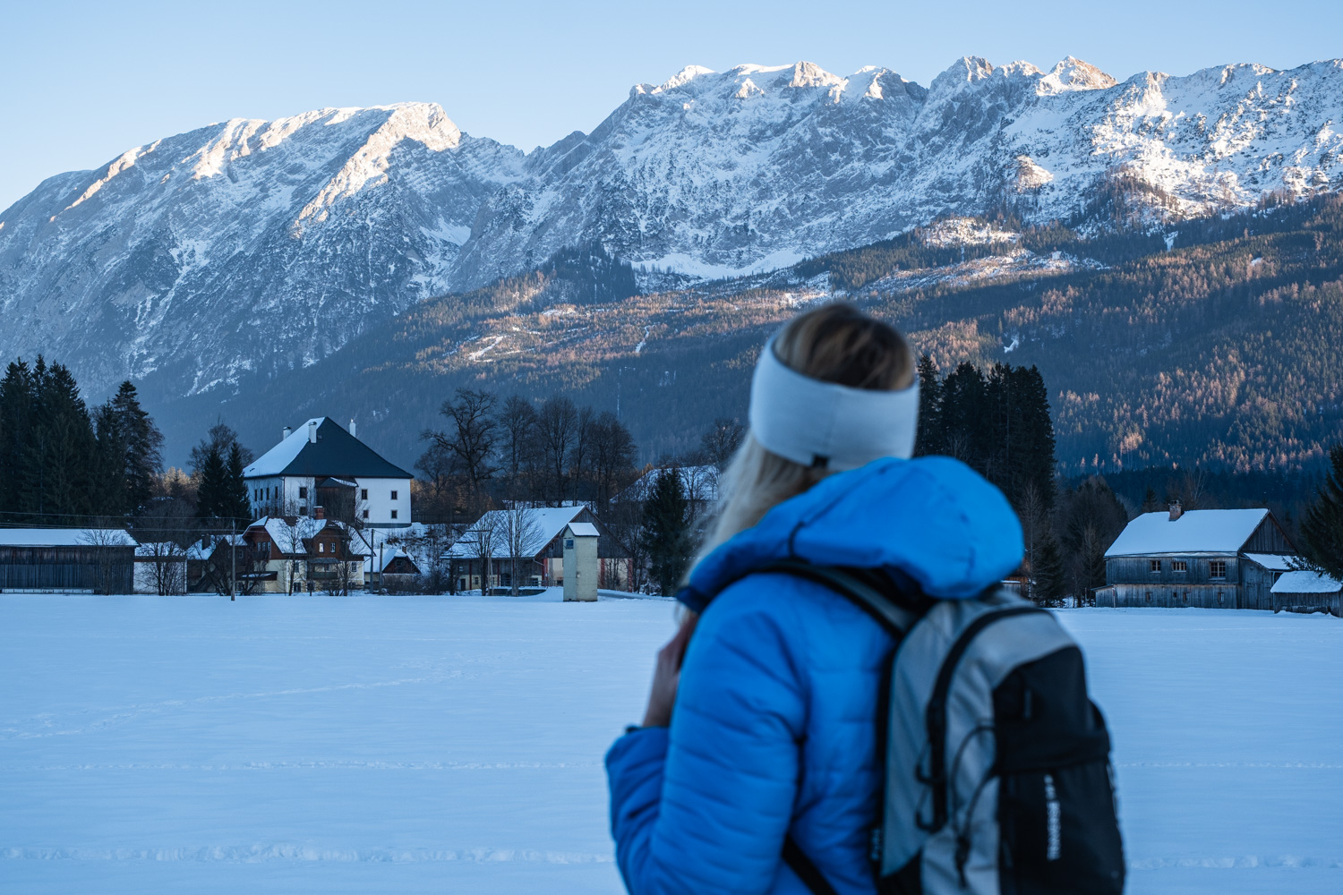 Nach der Brücke gehen wir rechts weiter und treffen wieder auf Langlaufloipen. Wegweiser zeigen uns den Weg für Winterwanderer an. Aussichtsreich wandern wir wieder in Richtung Bad Mitterndorf (Ort), vorbei an weiten verschneiten Wiesen mit Holzhütten. Die Kraglhütte, auch bekannt als Jausenstation S’Kragl, hat glücklicherweise auch im Winter geöffnet. An der nächsten Gabelung halten wir uns rechts. Der Grimming ist unübersehbar und bekommt immer wieder unsere Aufmerksamkeit. Auch den Lawinenstein bei der Tauplitzalm können wir sehen.