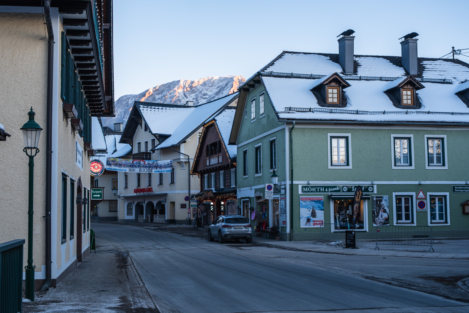 So langsam lassen wir die Zivilisation hinter uns und kehren Bad Mitterndorf den Rücken. Wir bleiben auf der Straße und sehen einige Langläufer auf den Loipen gleiten. Zu unserer Linken liegt das Hackenschmiedmoos (Lammer Moor) und wir nähern uns dem Mündungsbereich der Salza in den Stausee Paß Stein. Von der Brücke blicken wir auf den Fluss, wie er sich in einer leichten Kurve durch die verschneite Winterlandschaft schlängelt, dahinter dunkle Fichten.