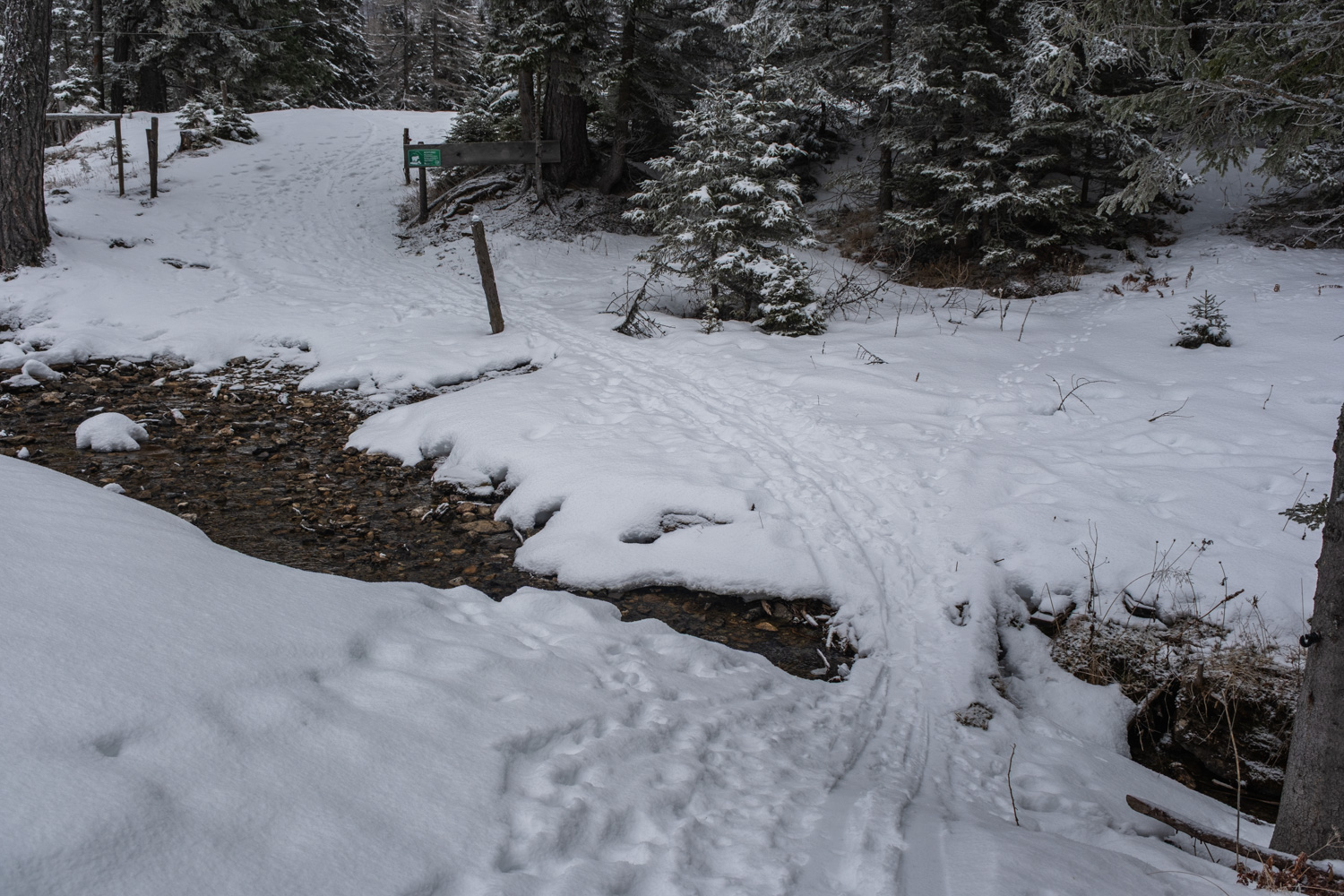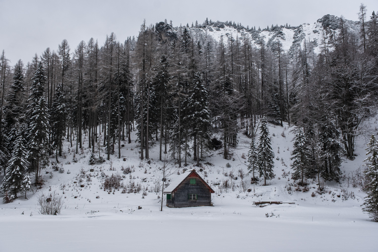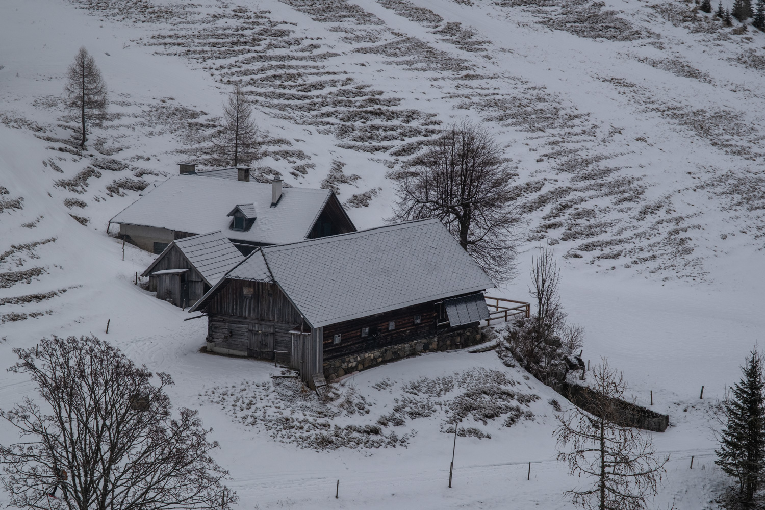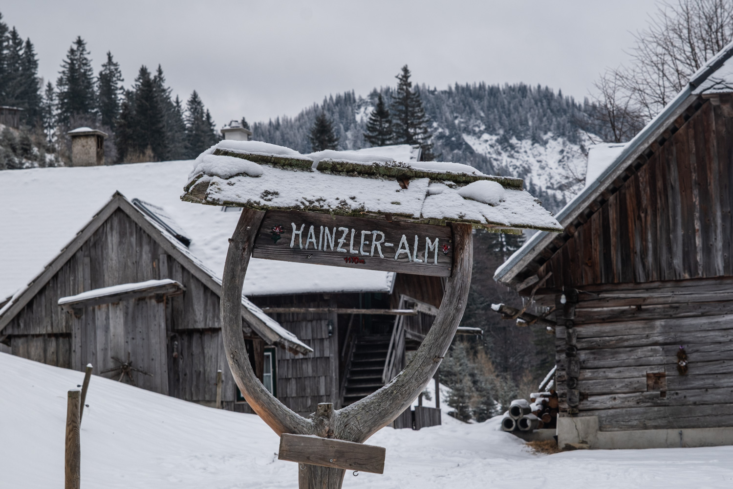Ausgehend vom Parkplatz beim Gasthaus Bodenbauer gehen wir in westliche Richtung und folgen der markierten Route Nr. 839 (Hainzleralmweg). Zunächst ist der Weg noch gestreut, aber nach kurzer Zeit lohnt es sich schon, die Schneeschuhe an die Schuhe zu schnallen. Wir gehen eine Zeit lang auf dem breiten Forstweg, der zu weiteren Hütten bzw. Häusern und leicht bergauf führt. Unser Weg verläuft ein Stück parallel zum Joserbach. Nur für ein kurzes Stück verlassen wir die Forststraße und wandern links vom Bach weiter auf einem richtigen Wanderweg, der auch schneeschuhgeeignet ist. Wir erkennen zudem die ganze Zeit auch Spuren von Tourenski. Rechts weiter unten erkennen wir die Hainzleralm mit ihren urigen Holzhütten. Der steile Aufstieg zur Joseralm über die Wiese ist dann doch noch einmal fordernd. Im Anschluss sind es bis zum Josersee nur mehr 30 weniger anstrengende Höhenmeter.