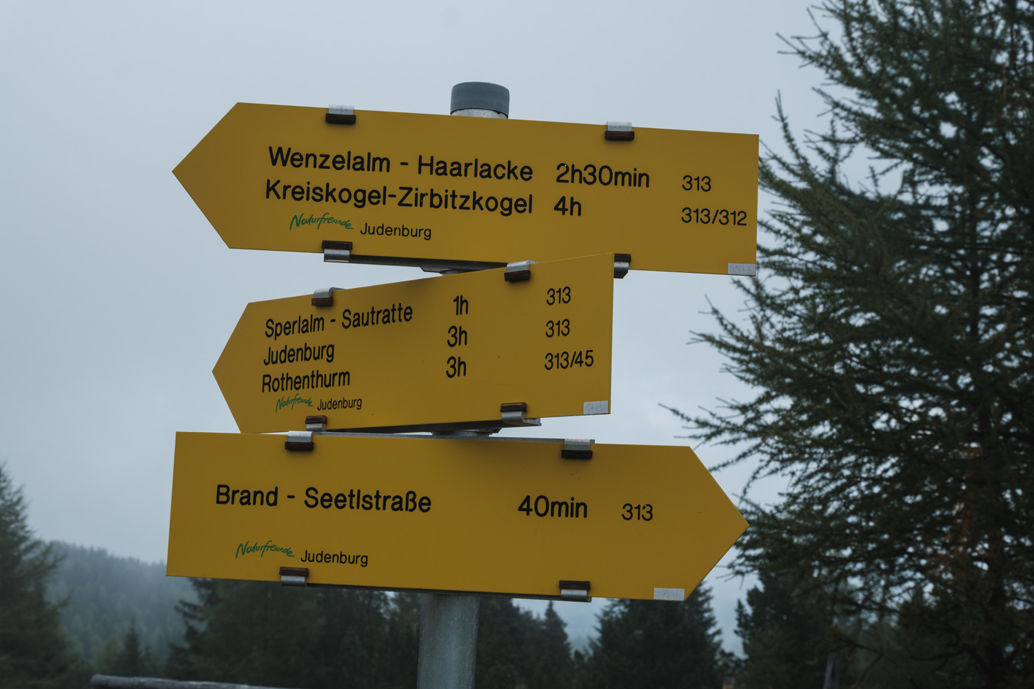 Wir starten die Wanderung auf die Hohe Ranach in den Seetaler Alpen auf Höhe der Soldatenkirche. Dort finden wir auch einen kleinen Teich und Rastbänke und Tische. Für ein Stück gehen wir in Richtung Osten, am Straßenrand entlang, bis wir zu einem versteckten Schilderbaum gelangen. Links ist ein Tor mit mehreren Warnschildern, die auf das Militärgebiet hinweisen. Rundherum befinden sich Einrichtungen des österreichischen Bundesheeres. Da aktuell keine Übungen stattfinden (haben wir vorher auf der offiziellen Website nachgelesen) und auch die Warnleuchte nicht aktiv ist, setzen wir unsere Tour fort und wandern nun durch das Gelände des Truppenübungsplatzes Seetaler Alpe. Es geht durch den offenen Wald mit mäßiger Steigung bis wir zu einer Almwiese gelangen und uns links halten. Unter freiem Himmel wandern wir über den Brandriegel wieder ein Stück hinab.
