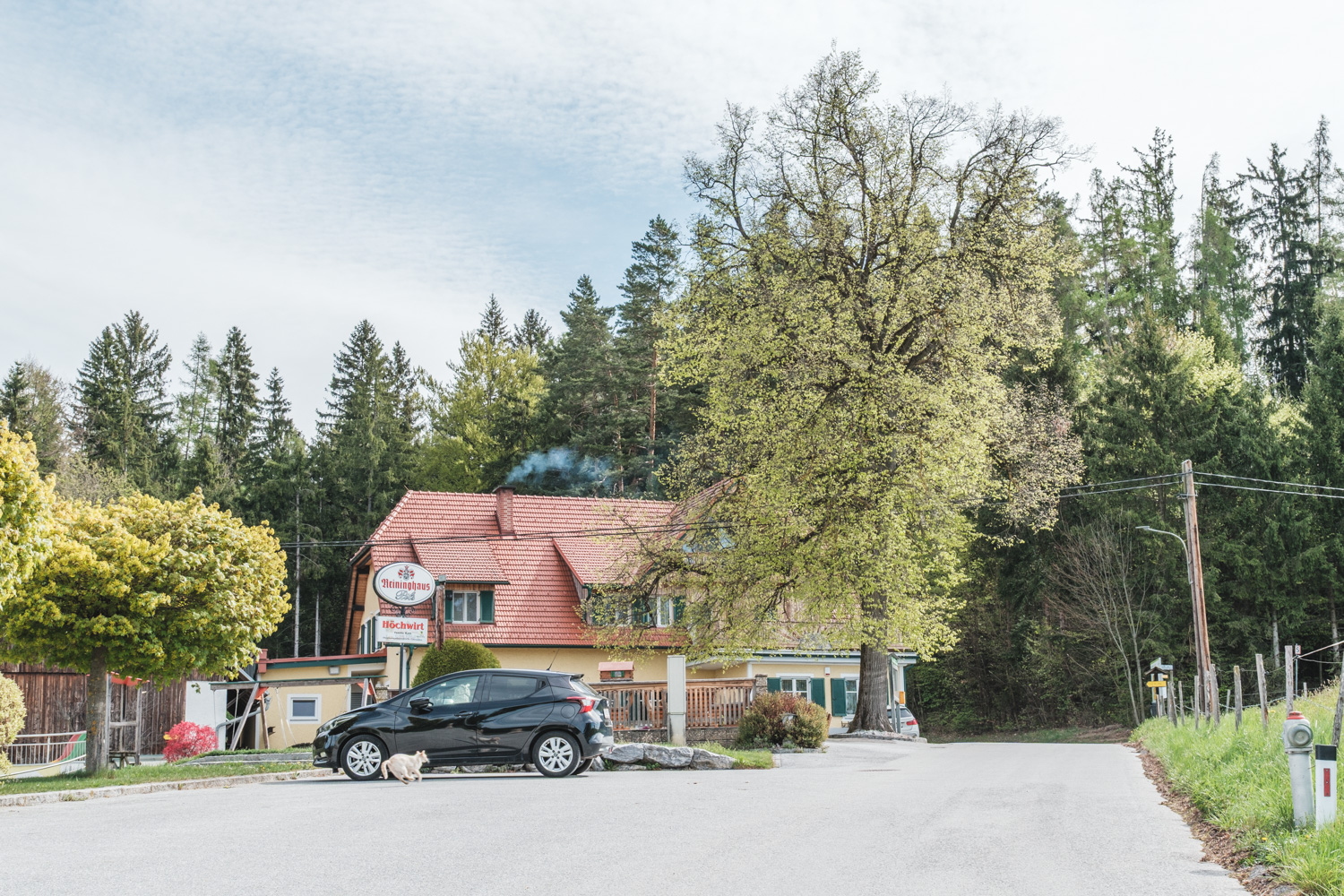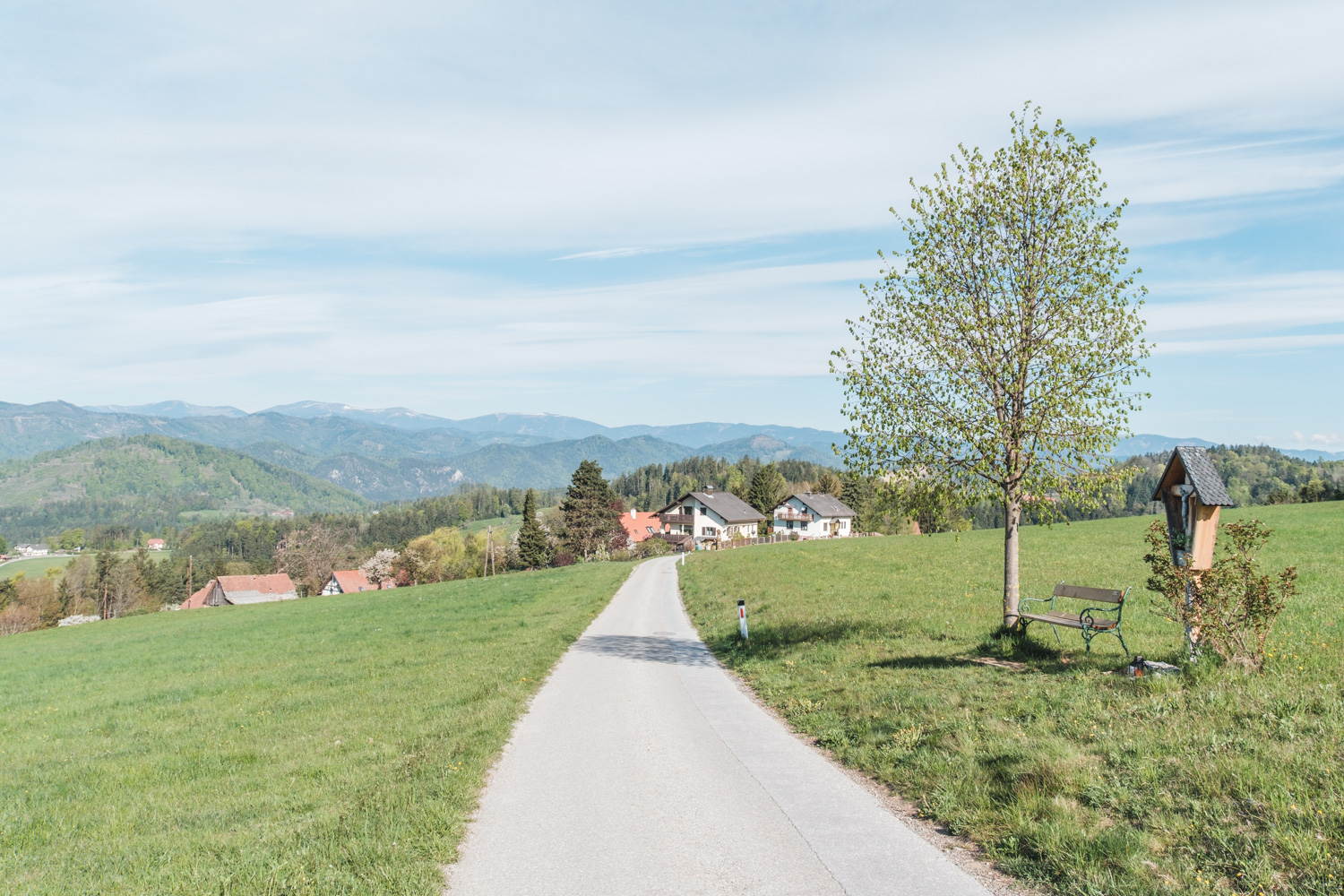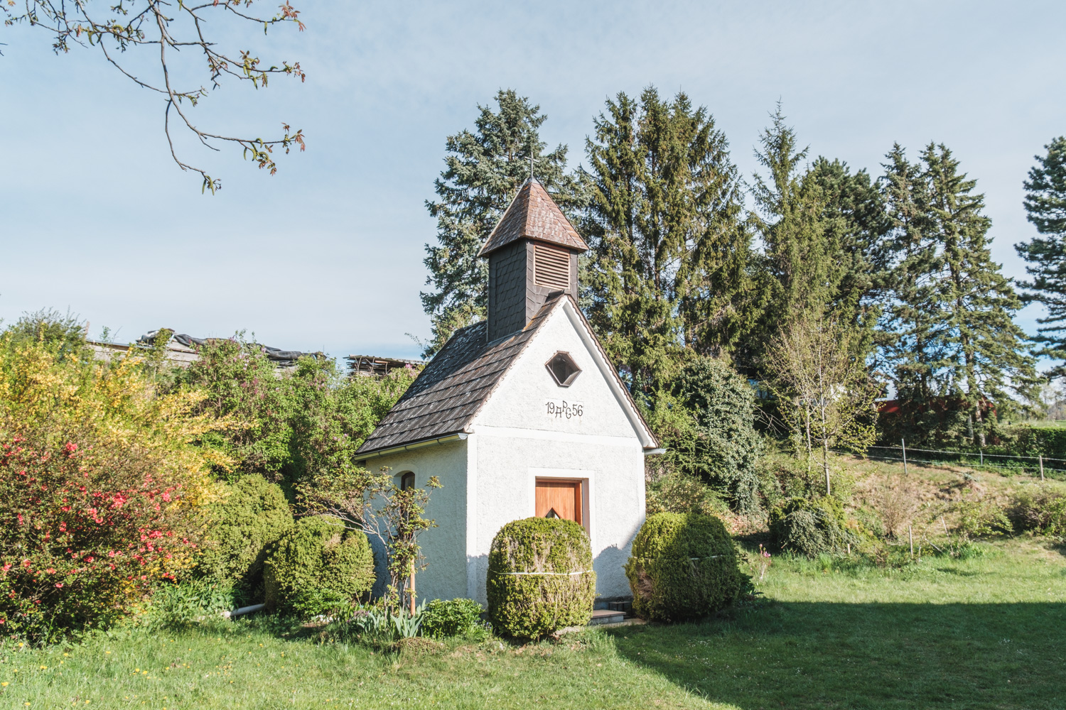 Bald verlassen wir die ruhigen Nebenstraßen und wandern auf leicht ansteigenden Pfaden durch dichten Wald. Zwischendurch haben wir die Aussicht im Rücken und können auf die weit entfernte, auf einem Hügel thronende Wallfahrtskirche Maria Straßengel blicken. Weiter geht es eine Zeit lang durch üppige Vegetation, bis wir auf den Alpengarten Rannach stoßen, der einen Besuch wert ist. Neben dem Gasthaus laden mehrere Rastbänke zu einer Pause ein. Kurz darauf kommen wir erneut zu einer schönen Kapelle und zu Pferdekoppeln. Hier haben wir die Höhenmeter geschafft, denn wir sind am höchsten Punkt der Tour.