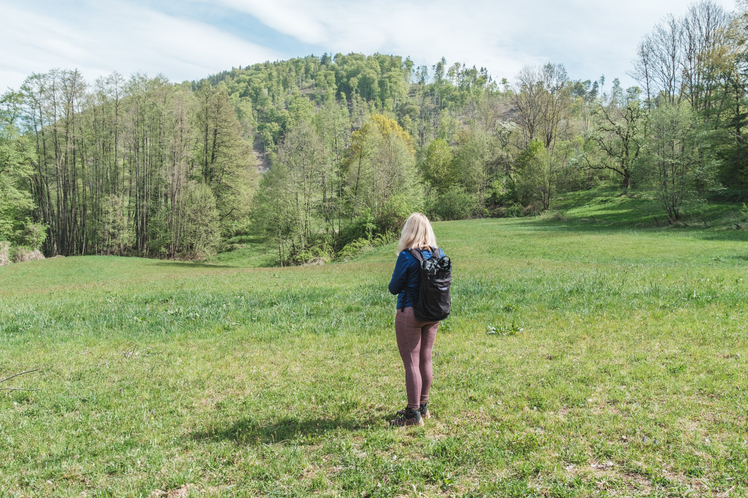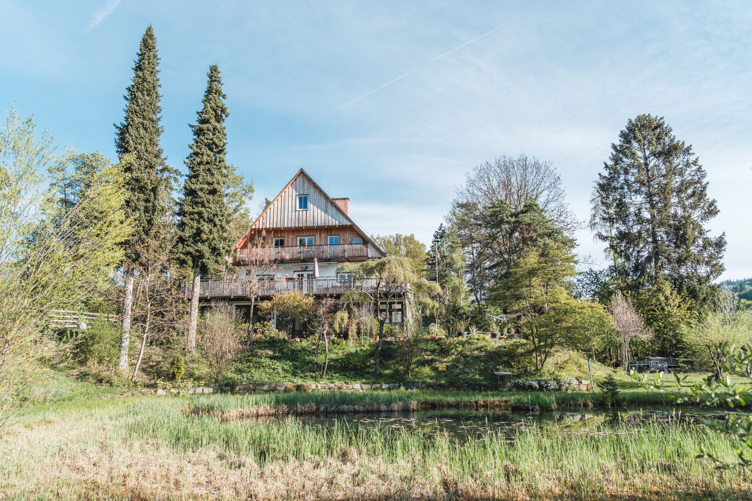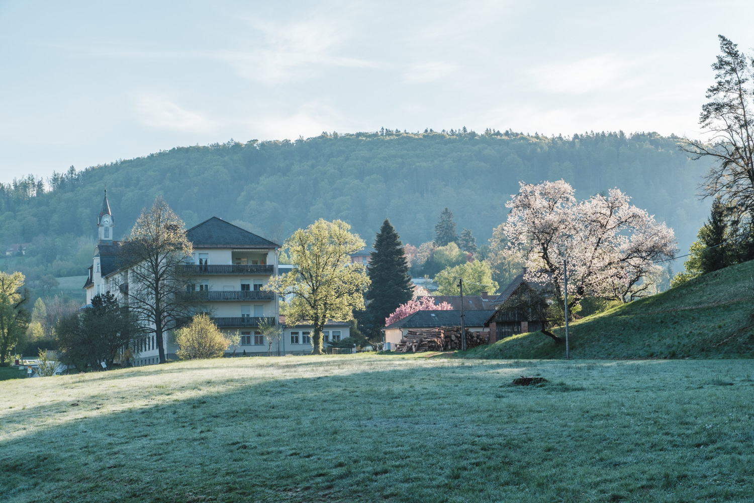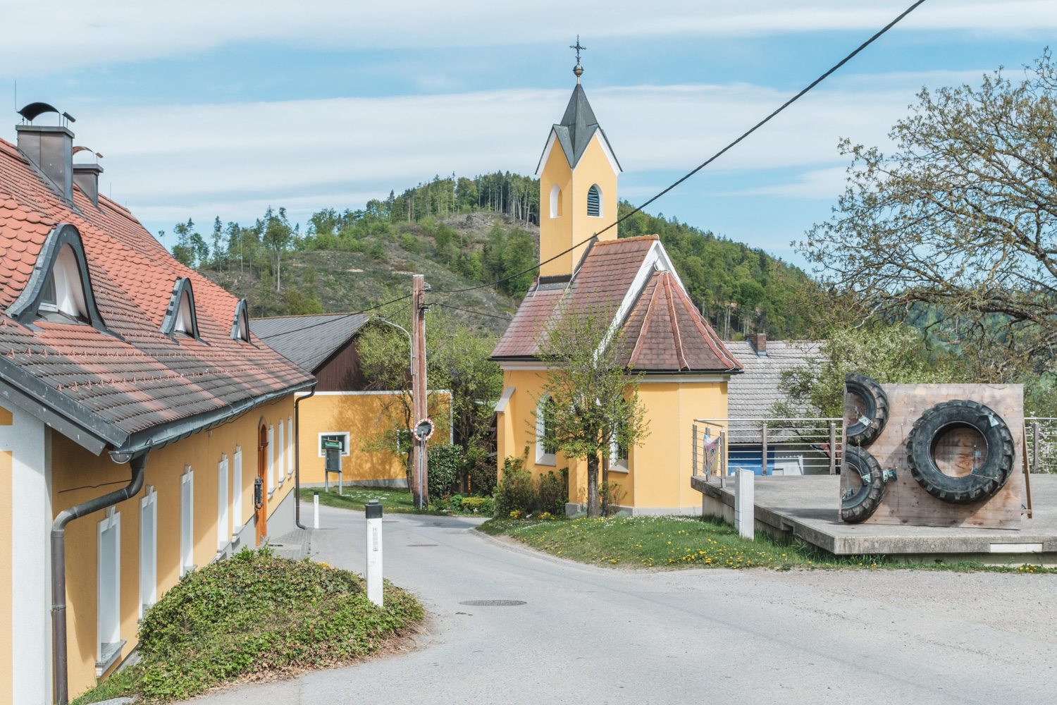 Bald verlassen wir die ruhigen Nebenstraßen und wandern auf leicht ansteigenden Pfaden durch dichten Wald. Zwischendurch haben wir die Aussicht im Rücken und können auf die weit entfernte, auf einem Hügel thronende Wallfahrtskirche Maria Straßengel blicken. Weiter geht es eine Zeit lang durch üppige Vegetation, bis wir auf den Alpengarten Rannach stoßen, der einen Besuch wert ist. Neben dem Gasthaus laden mehrere Rastbänke zu einer Pause ein. Kurz darauf kommen wir erneut zu einer schönen Kapelle und zu Pferdekoppeln. Hier haben wir die Höhenmeter geschafft, denn wir sind am höchsten Punkt der Tour.