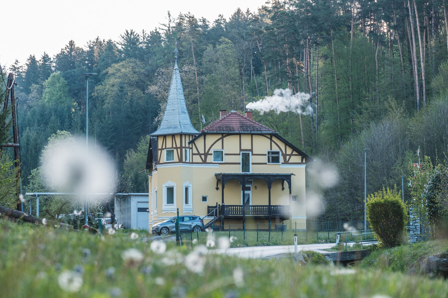 Wir gehen durch den Hahngraben. Später treffen wir auf eine Rastbank mit besonders schöner Aussicht, an der es sich ebenfalls zu verweilen lohnt. Das nächste Ziel ist das Gasthaus „Zum Höchwirt“, zu dem ein schöner Gastgarten gehört. Nun geht es bergab durch die Siedlung Jasen und weiter nach Friesach, bis wir uns dem Bahnhof Stübing nähern und einen Blick auf den Pfaffenkogel haben. Wir wechseln auf die andere Murseite und erreichen, nach rechts gehend, unser Ziel: den Bahnhof Stübing.