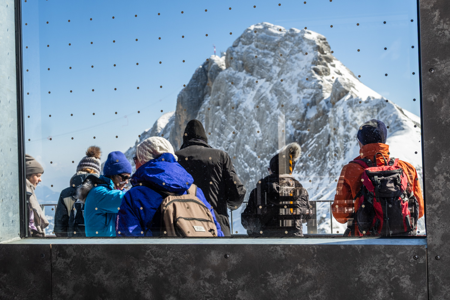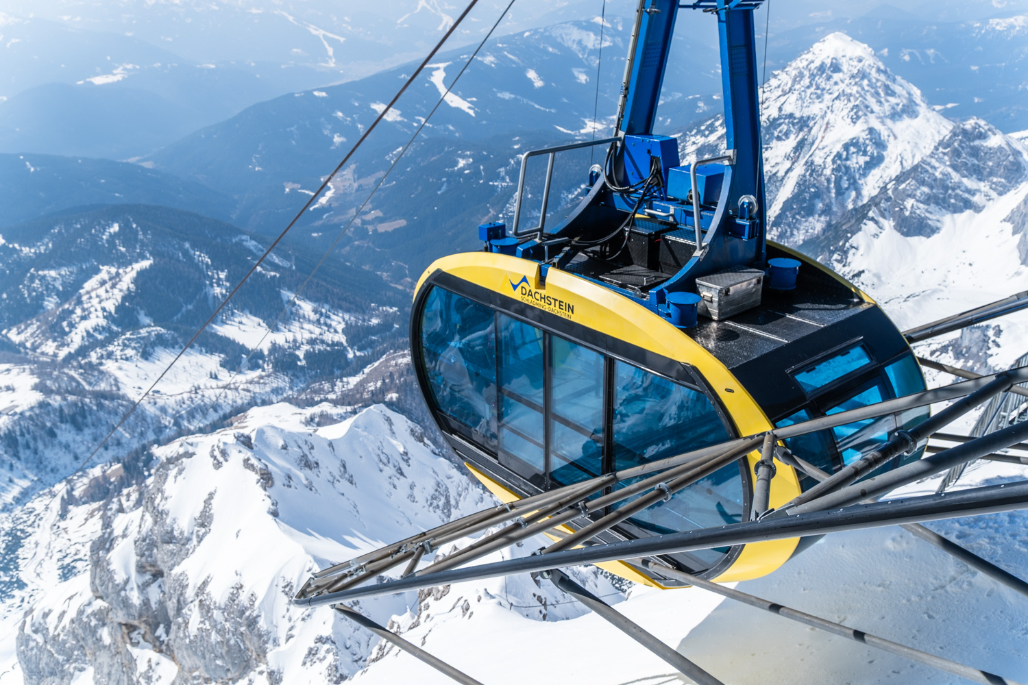 Mit der Gondel der Dachstein Gletscherbahn überwinden wir gleich einige Höhenmeter und gelangen in kurzer Zeit hinauf zum Hunerkogel auf 2.687 Metern Seehöhe mit Bergstation.