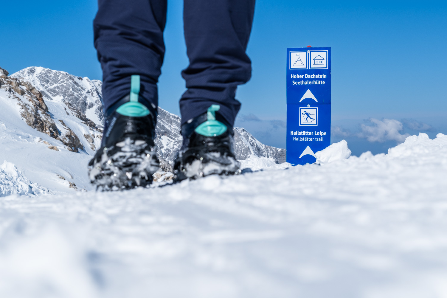 Hier beginnt unser Winter-Panoramaweg mit spektakulären Ausblicken in alle Richtungen auf die beeindruckende Bergwelt des Dachsteinmassivs knapp unter dreitausend Metern und weit darüber hinaus. Damit verlassen wir die Steiermark und wandern nach Oberösterreich.