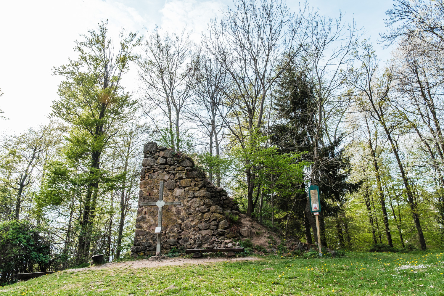 Den höchsten Punkt haben wir noch nicht erreicht und so wandern wir zunächst noch gemütlich weiter durch den Gleichenberger Wald bis wir schließlich zum gleichnamigen Gipfel aufsteigen. Der Anstieg zum 598 Meter hohen Gleichenberger Kogel wirkt stellenweise nahezu senkrecht. Oben erwarten uns eine Sitzgelegenheit, ein Gipfelkreuz und Ruinen.