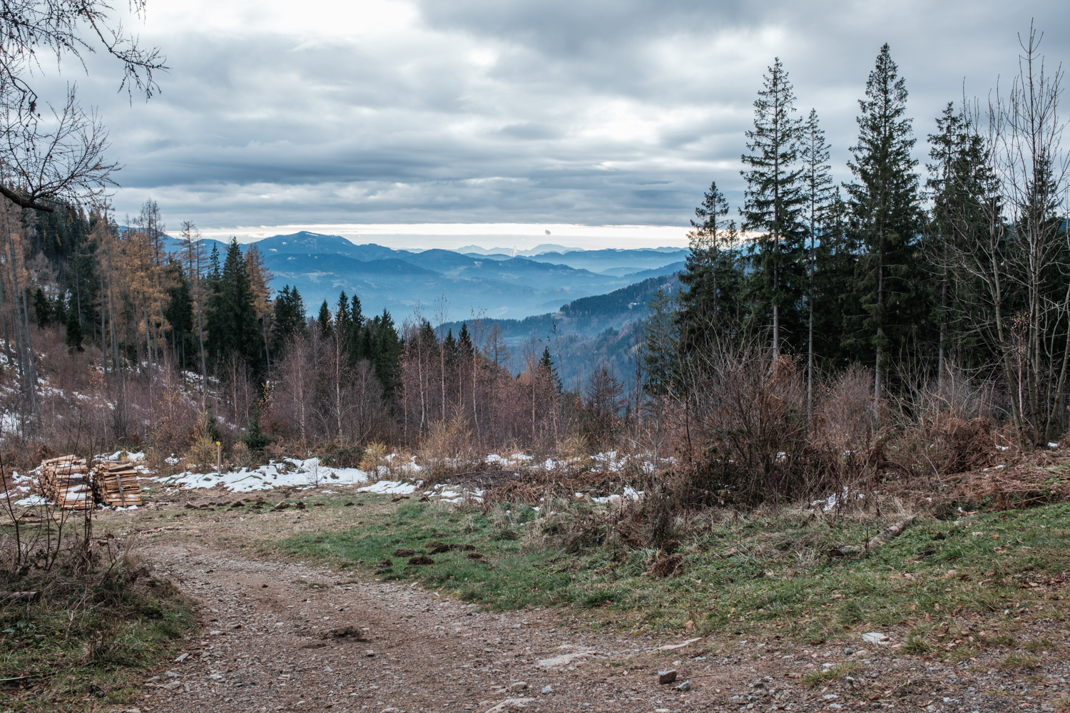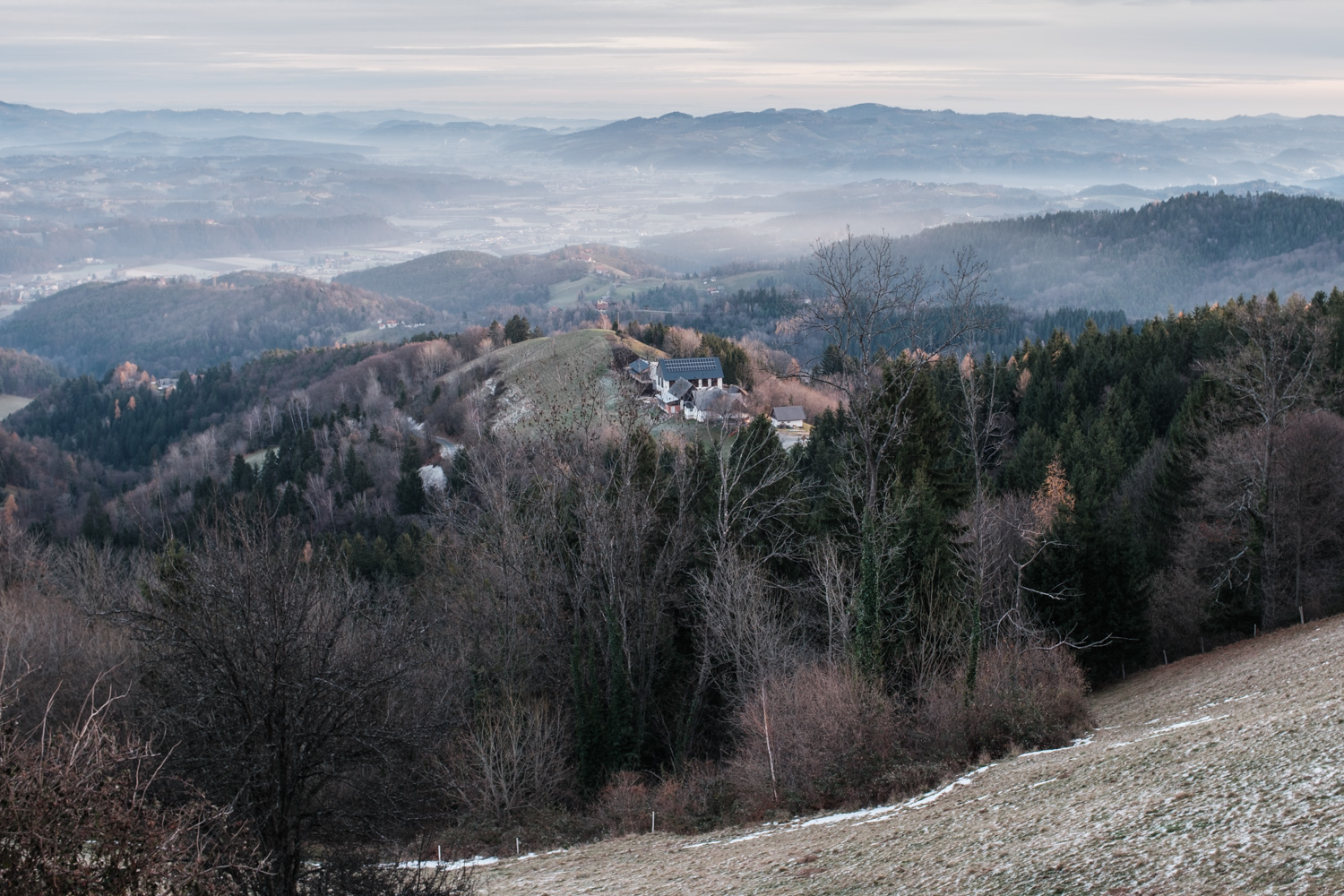 Oberhalb von Oberhaag thront die Wallfahrtskirche Sv. Pankracij/St. Pongratzen bereits auf slowenischem Grund. Hier führt die fünfte Etappe des Südalpenwegs entlang der Grenzlinie in westliche Richtung – auf einem Höhenzug knapp unter 1.000 Meter Seehöhe, zwischen zahlreichen Grenzsteinen hindurch, meist durch Wald.