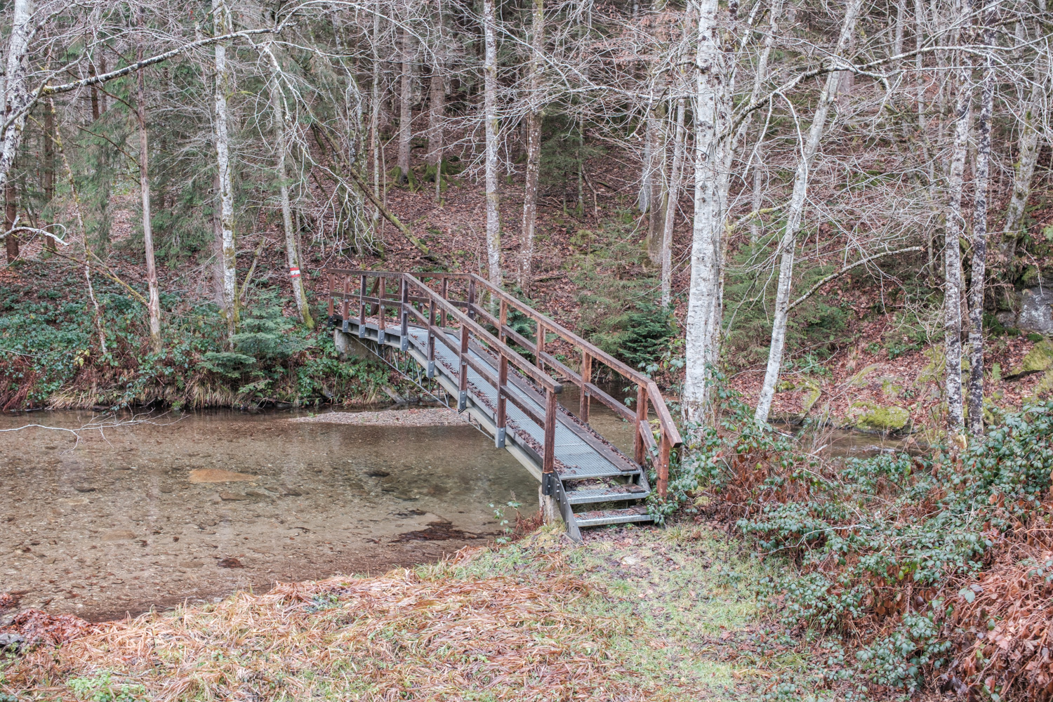 Bald beginnt ein längerer Anstieg, und wir gelangen zum Zweibach und der sogenannten Märchenwiese, wo weitere Rastbänke stehen. Ab hier startet der letzte Aufstieg dieser Etappe – zunächst in Serpentinen auf einem Bergpfad, der nach einiger Zeit in einen Naturweg übergeht und schließlich über eine Wiese wieder auf Asphalt führt. Das Etappenziel, das Gasthaus Strutz in Laaken, ist erreicht.