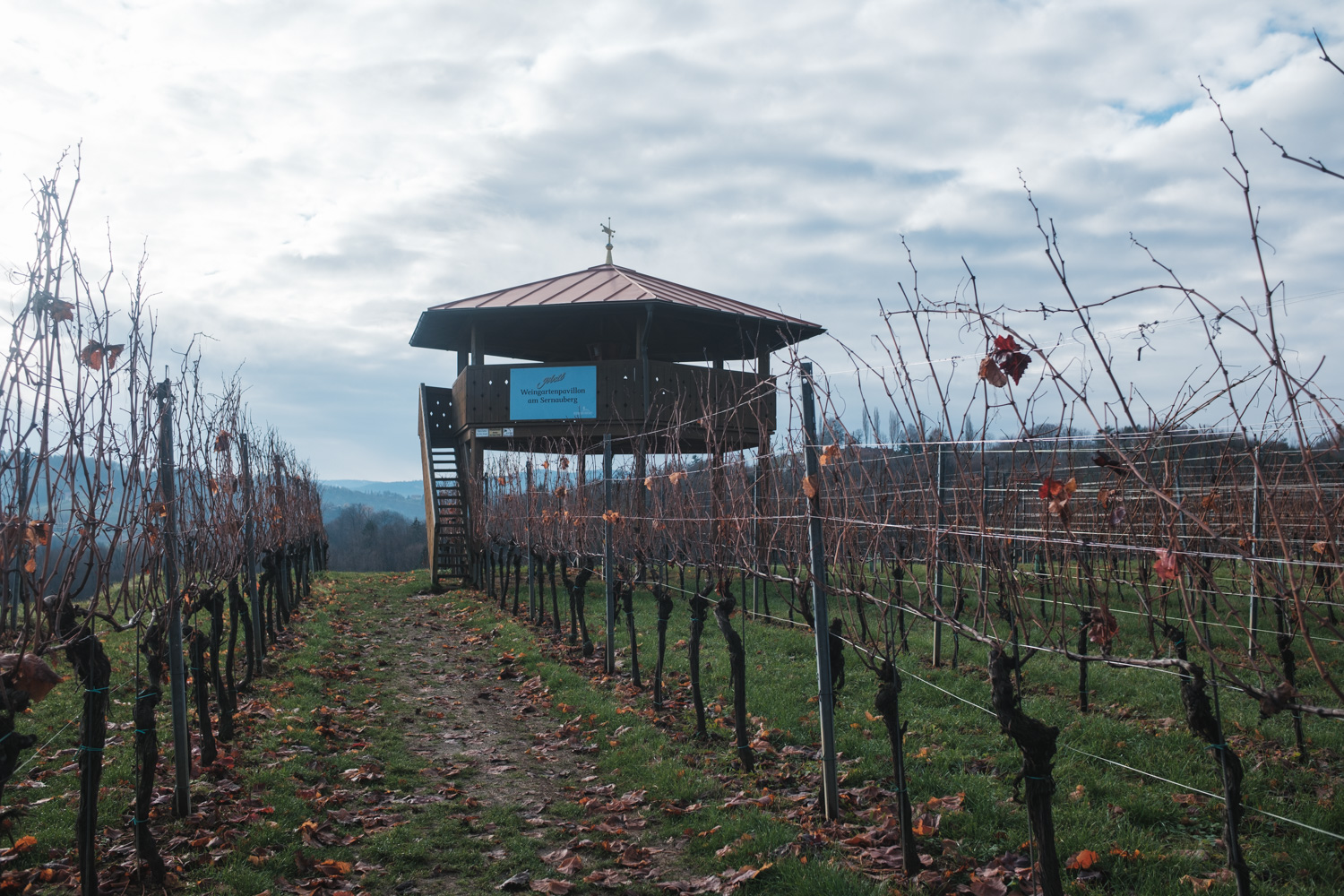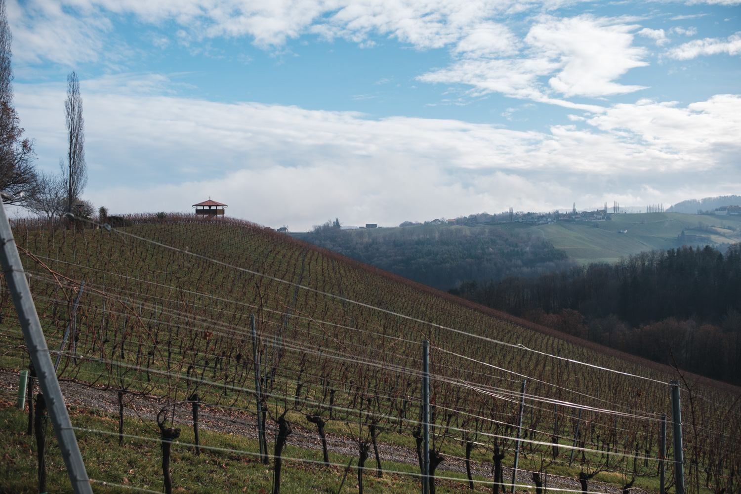 Am Bahnhof Ehrenhausen an der Weinstraße kehren wir der Mur den Rücken und gehen ein Stück auf dem Südalpenweg, bis wir den Wegweisern Richtung zum Wasserturm Weinleiten folgen. Diesen sehen wir nach einiger Zeit aus der Ferne und erklimmen den 27-Meter-hohen Aussichtsturm. Die vielen Stufen gleich zu Beginn belohnen uns mit einer beeindruckenden Aussicht in alle Richtungen.