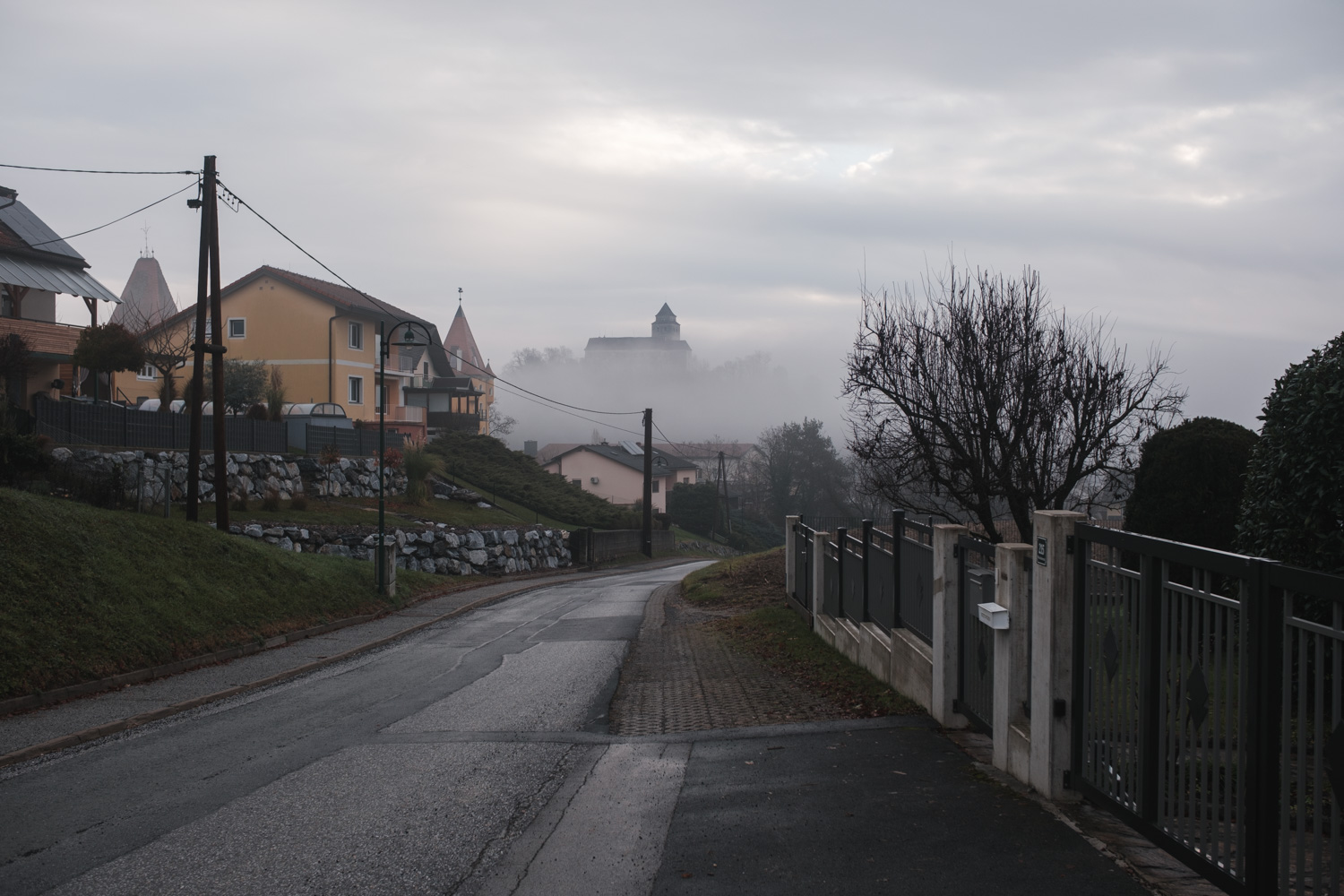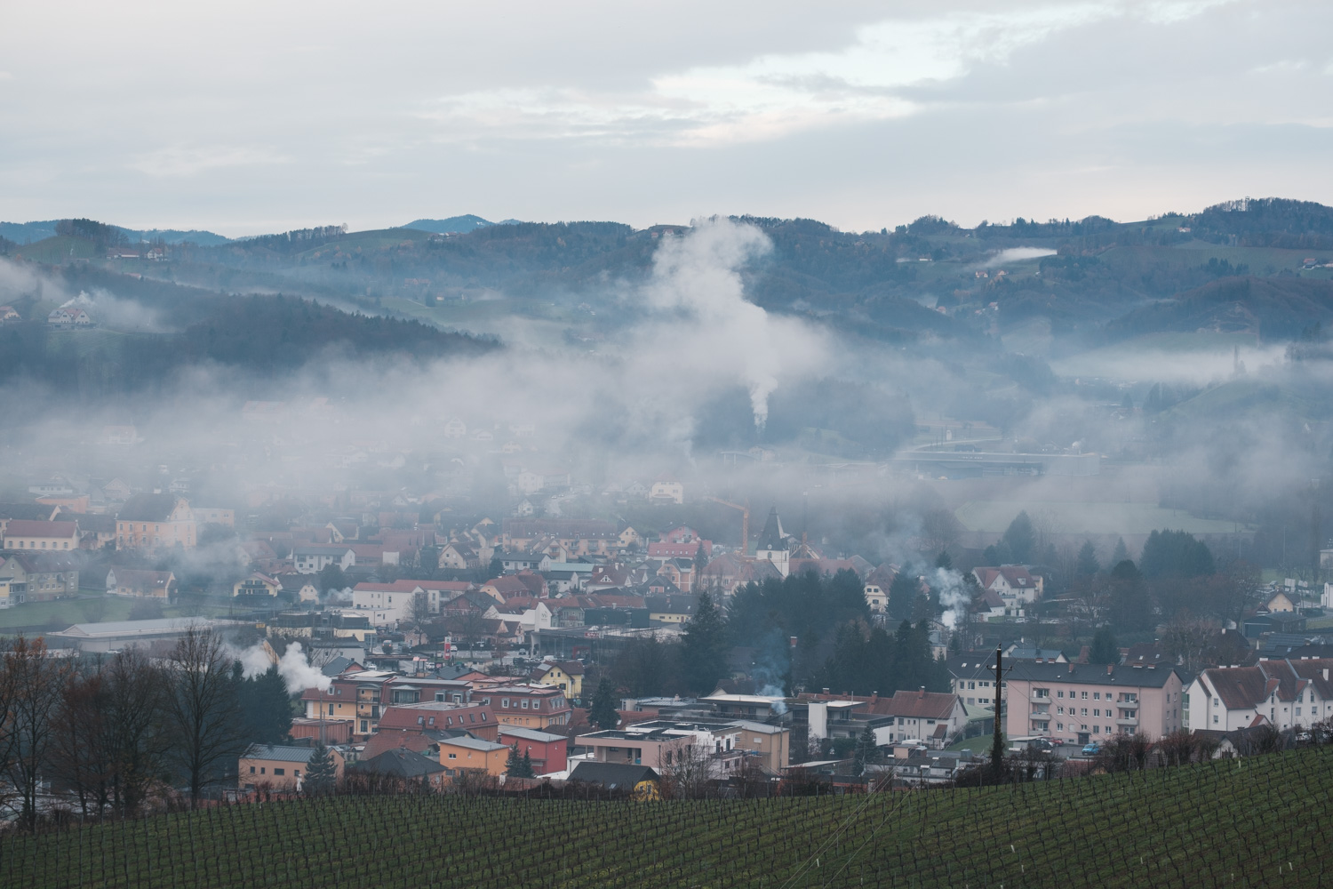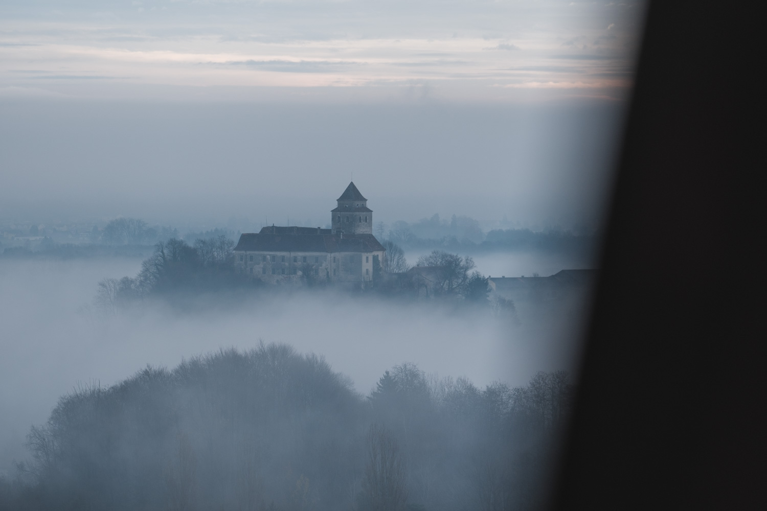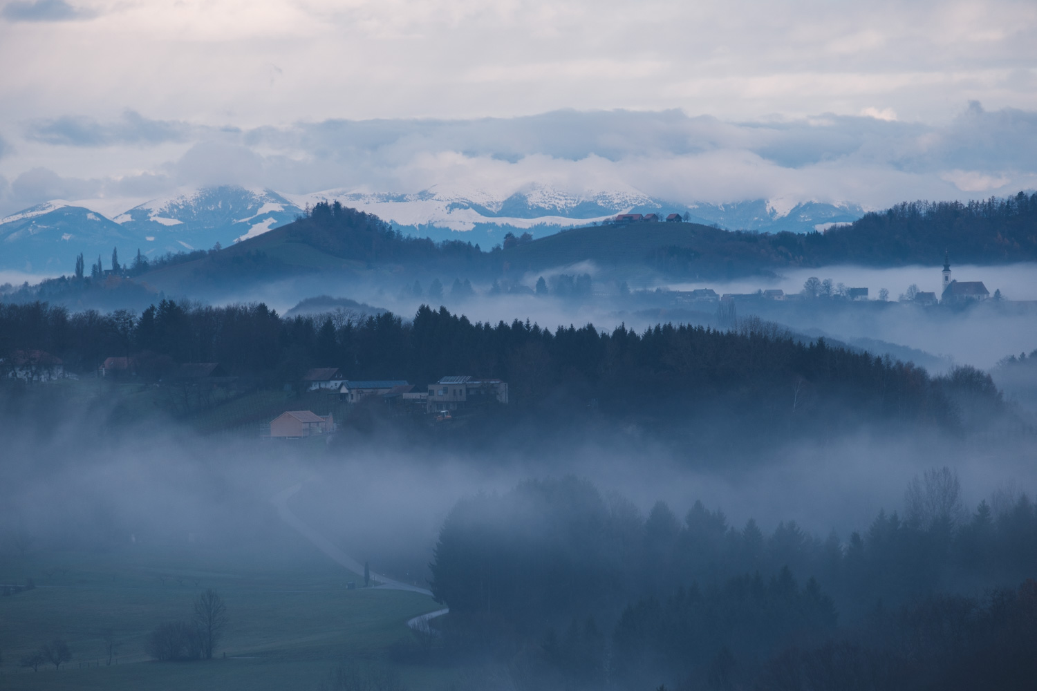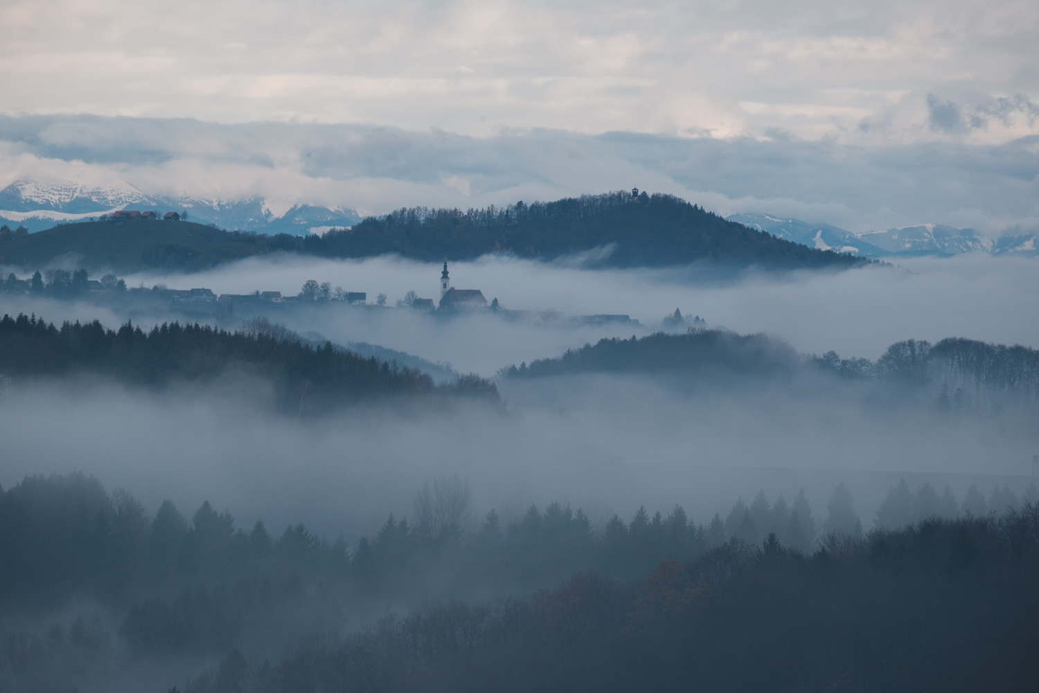 Eine besonders schöne Stimmung erwartet uns in der Früh, wenn der Hochnebel noch nicht ganz verzogen ist. Schloss Ehrenhausen und das Mausoleum liegen zum Greifen nah, weiter weg erblicken wir die mit Schnee bedeckten Gipfel der Koralpe. Weiter zu uns liegt Kitzeck und der Demmerkogel mit neuer Aussichtswarte. Auf slowenischer Seite liegt die Warte am Platschberg. Am Fuße des Turms befindet sich das Skoff Weingut und Buschenschank mit urigem Holzbau (das Presshäusl) und Rastbänken.