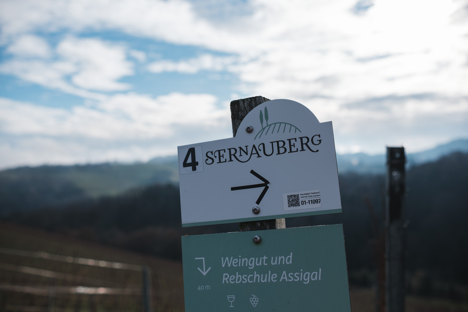 Hoch auf dem Sernauberg genießen wir den Ausblick auf Weinreben, Pappeln, Klapotetze und weit hinten im Tal den Weinort Gamlitz. Wir setzen unsere Wanderung fort und folgen den Wegmarkierungen. Immer wieder finden wir die Sernauberger Betriebe angeschrieben und so gehen wir von Weingut zu Weingut.